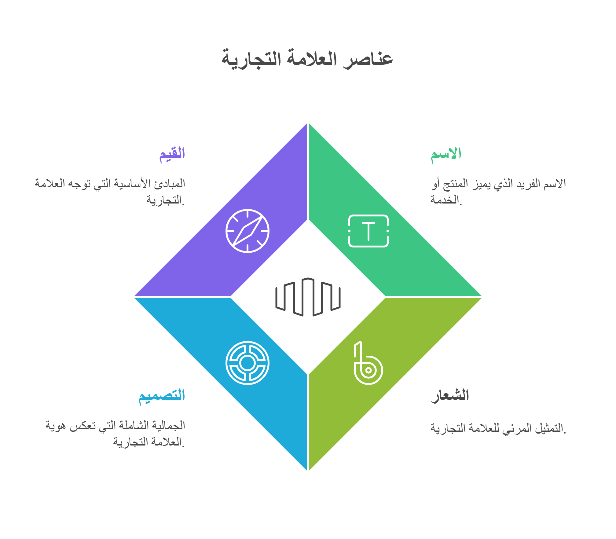 مع أن تصميم الشعار يعد من أول الأمور التي قد تتبادر إلى ذهنك عند انشاء ماركة تجارية، إلا أنه ينبغي أن يتم في مرحلة لاحقة من العملية، ذلك لأنه يمثل علامة فارقة لعلامتك التجارية، ويصعب تغييره بعد تثبيته، وهنا احرص على إنشاء شعار فريد وواضح ومفهوم وقابل للتطوير، ويمكن أن تروي من خلاله قصة علامتك التجارية.