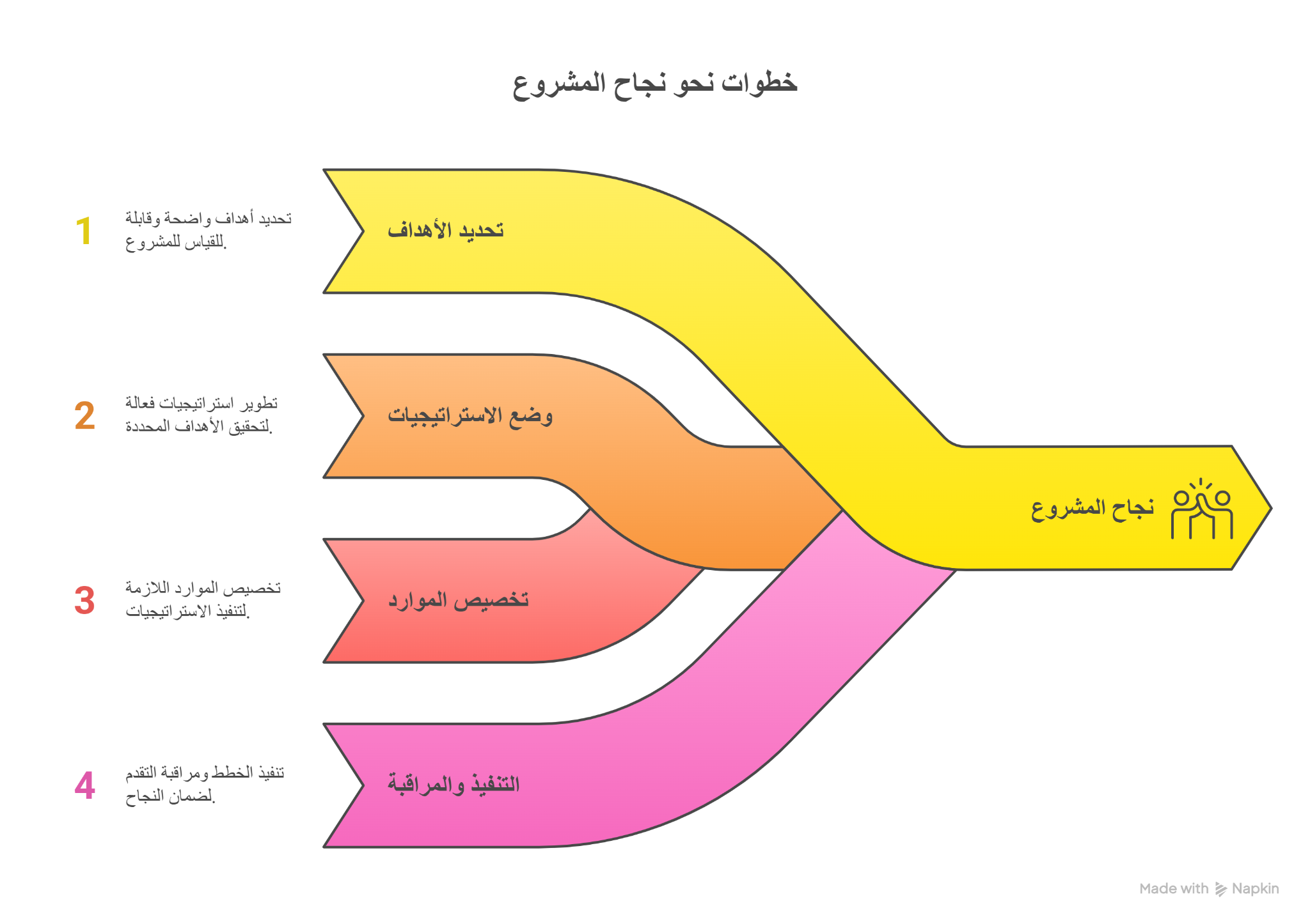 لا بد أن تعلم بأن الفعال يعتمد على تحديد أهداف واضحة ومسار تنفيذي دقيق للمشروع، وبعبارة أخرى، يهتم تخطيط المشروع بتحديد ماذا ومتى وكيف ومن سيتخذ الإجراءات اللازمة لتحقيق الأهداف المحددة، ويمكن تفصيل تلك الخطوات على النحو الآتي: