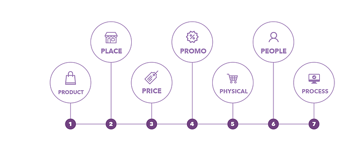 المنتج Product - السعر Price - المكان Place - الترويج Promotion - الأدلة المادية Physical والأشخاص People - والعمليات Processes.