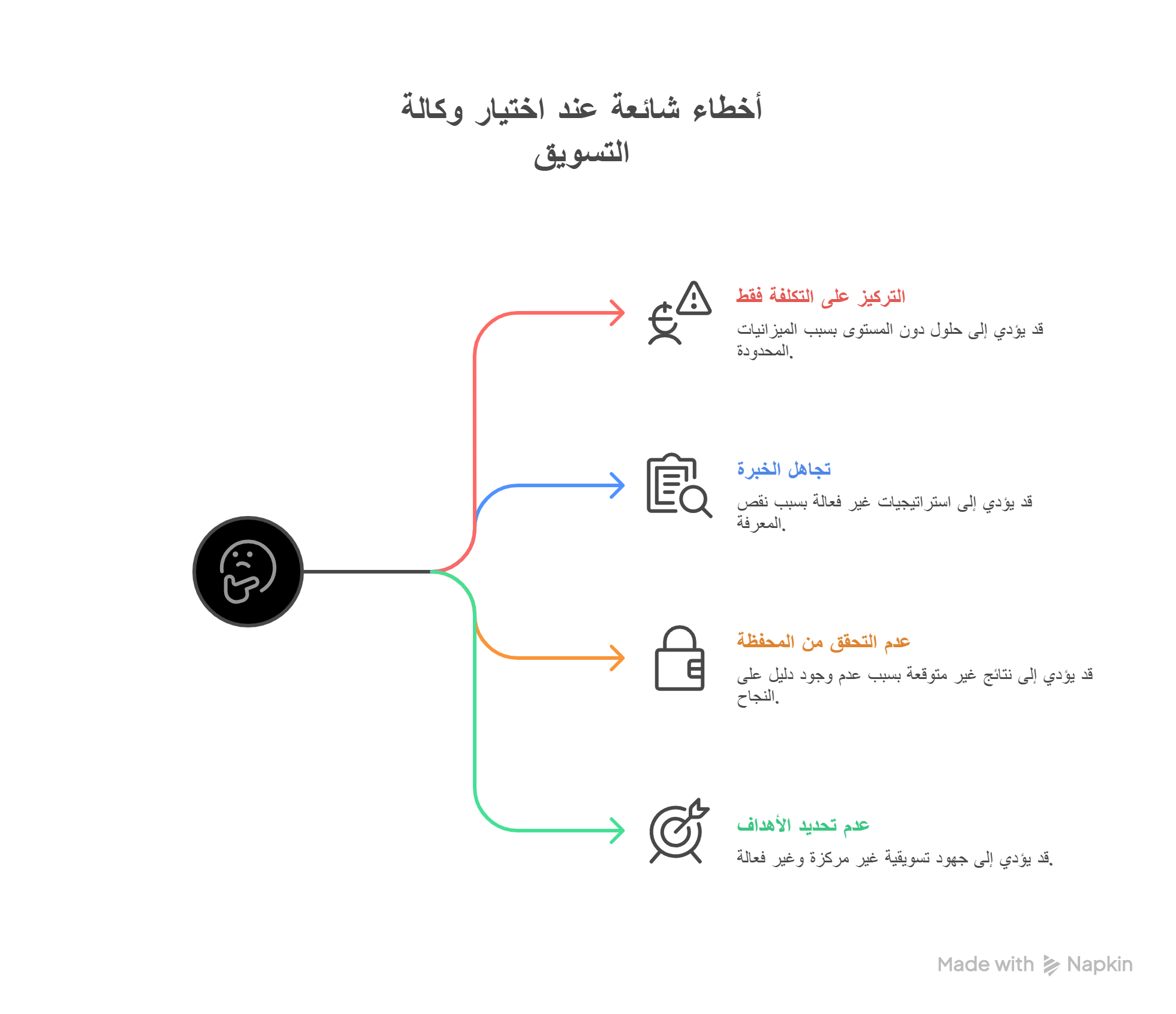 قد يكون اختيار وكالة تسويق رقمي مناسبة مهمة صعبة، خاصة في ظل وجود خيارات لا حصر لها في السوق السعودي، الأمر الذي يسهل الوقوع في الأخطاء التي قد تعيق نمو أعمالك، ولمساعدتك على اتخاذ قرار مدروس، دعنا نستعرض بعض الأخطاء الشائعة التي يجب تجنبها عند التعاقد مع وكالة تسويق إبداعي:
