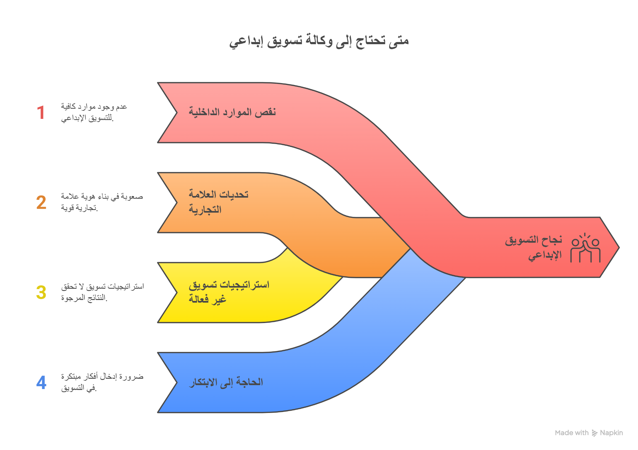 لا بد أن تعلم بأن وكالة التسويق الإبداعي تساعد العلامات على بناء حضور قوي ومبتكر، وبالتالي فإن قرار يعد خطوة هامة لبعض الشركات لتسريع نمو أعمالها بطرق قد لا تتخيلها، وهنا تظهر حاجتك للاستعانة بوكالة تسويق إبداعي خاصة إذا كنت قد استنفذت جميع الحلول لتطوير علامتك التجارية ورفع مستواها، إذًا متى تشعر بأن الوقت قد حان للاستعانة بوكالة تسويق إبداعي؟ إليك 5 أسباب رئيسية لذلك: